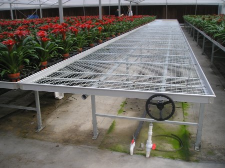 移動苗床標準高度0.7m,可以進行微調(diào),標準寬1.7m,也可以根據(jù)溫室寬度定制,長度可根據(jù)用戶要求定做;苗床網(wǎng)一般采用鋼絲焊接,再進行熱浸鍍鋅處理,防腐性能高,承重能力好,壽命長;網(wǎng)格一般為130x25mm或130x30mm。