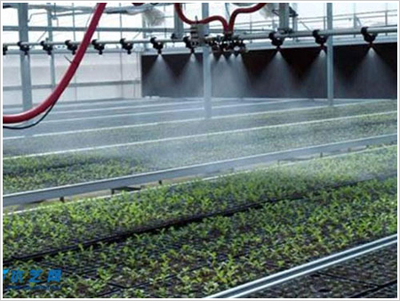 噴灌機懸掛在溫室上部的雙軌道管上,利用微電腦和磁性號進行控制,并加以遙控裝置,自動化程度很高,能夠根據(jù)用戶的選擇實現(xiàn):正向運行、反向運行、連續(xù)噴灌,及相應(yīng)的正向噴淋、反向噴淋以及往返噴淋。噴灌機雙臂噴灌管上每個噴頭內(nèi)含有三種不同流量和霧化程度的噴嘴,輕輕轉(zhuǎn)動該噴頭就可選擇合適的噴嘴。