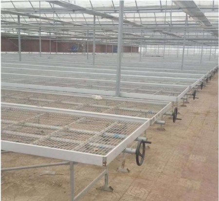 苗床顧名思義就是用來放苗的床,其分為固定苗床和可移動苗床。固定苗床就是苗床固定在了種植溫室地面上,床面不可移動。手搖式移動苗床就是床面可以移動的床。由于固定苗床的土地利用率較低,因此逐漸被手搖式苗床所取代。